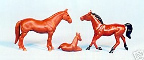 Ertl bay Morgan (left) , one fine white line, $3.00 Standing chestnut adult QH (left), new condition -- $3.00. (The foal was sold.)
